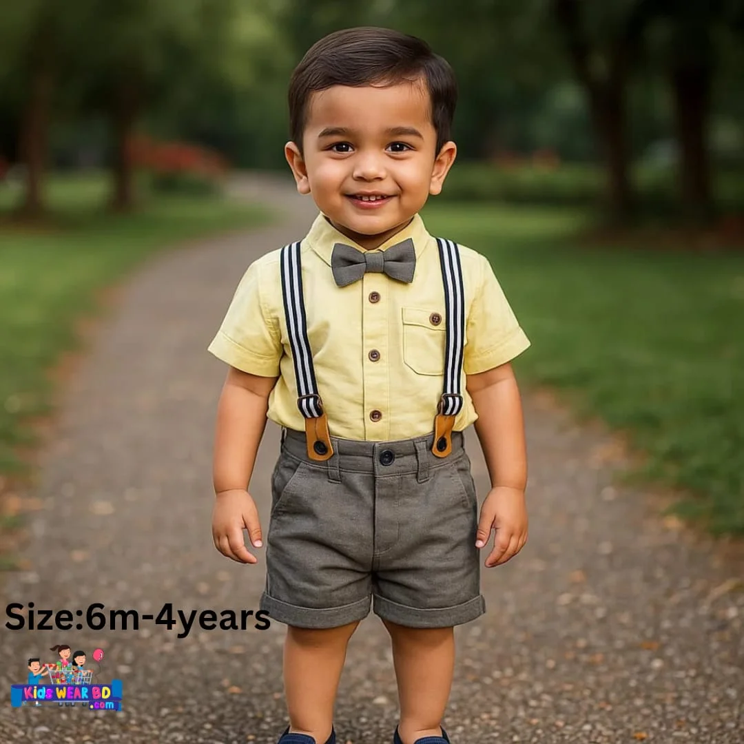 ম্যাটেরিয়ালস: শার্ট: 100% Cotton (নরম ও শ্বাস-প্রশ্বাসযোগ্য কাপড়) শর্টস: Cotton Blend (আরামদায়ক ও টেকসই) বো টাই ও সাসপেন্ডার: Elastic with Faux Leather Detailing. Color Yellow Size 12 Months-18 Months, 6 Months-12 Months