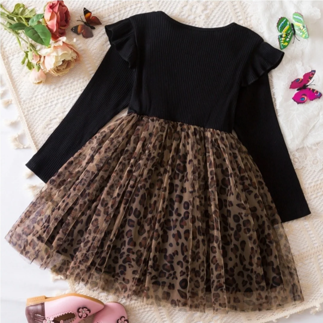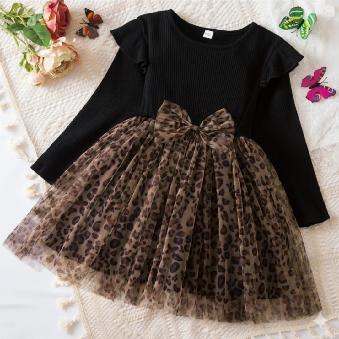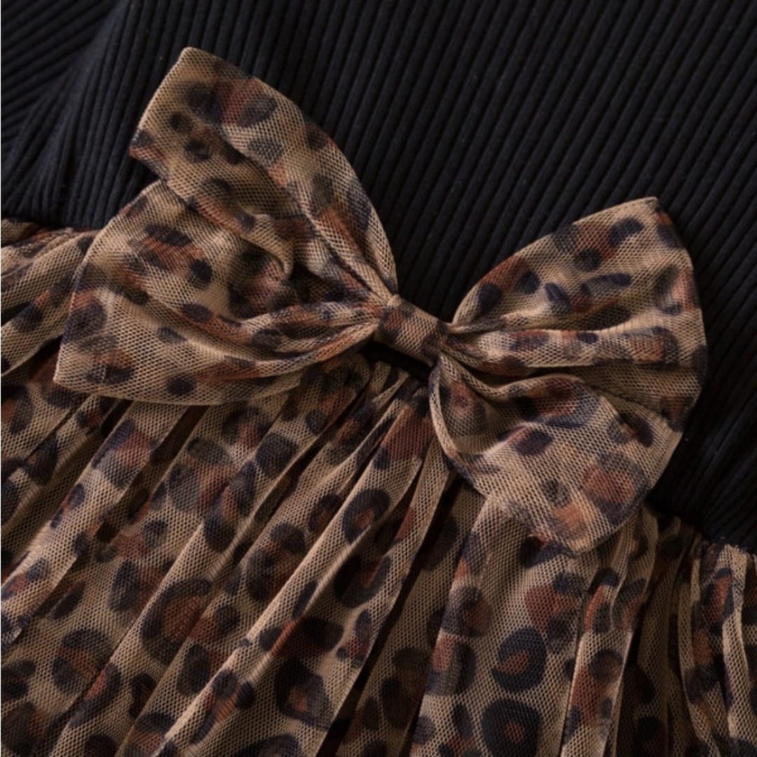 ✓ ডিজাইন:কালো টপ, সুতির উপাদানে দীর্ঘ হাতা লিওপার্ড প্রিন্ট টুল স্কার্ট কোমরে বড় সাটিন বাউন।