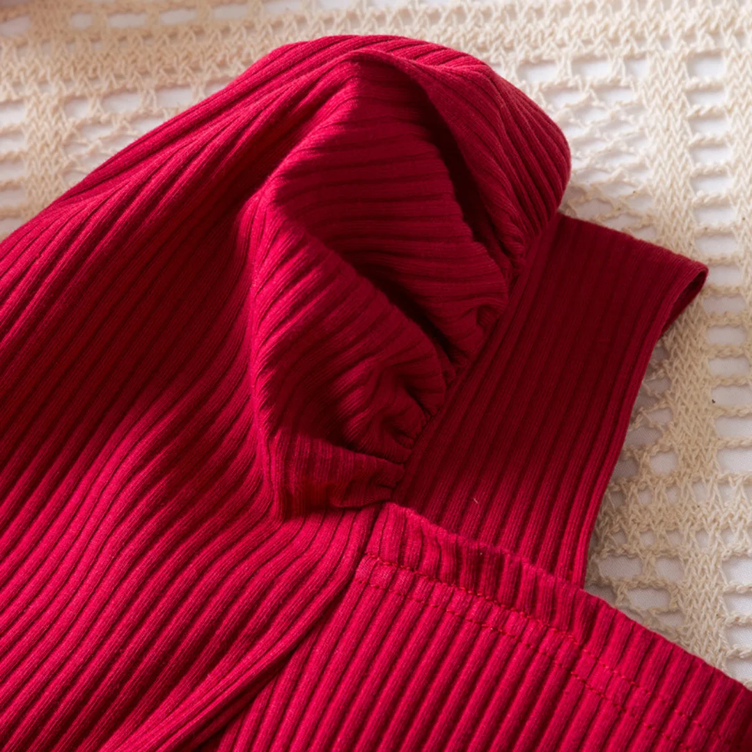 ✓ ডিজাইন:রেড রিবড টপ, স্লিভ সহ সাদা টুল স্কার্টে রেড ফুল এবং প্রজাপতির ডিজাইন